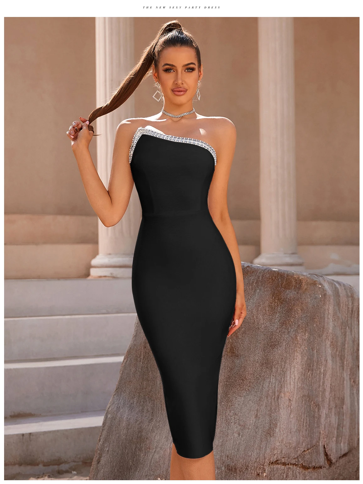 Olivia Summer One Shoulder Bodycon Bandage Dress For Women Sexy Sleeveless Diamonds Midi Evening Runway Party Female Dresses