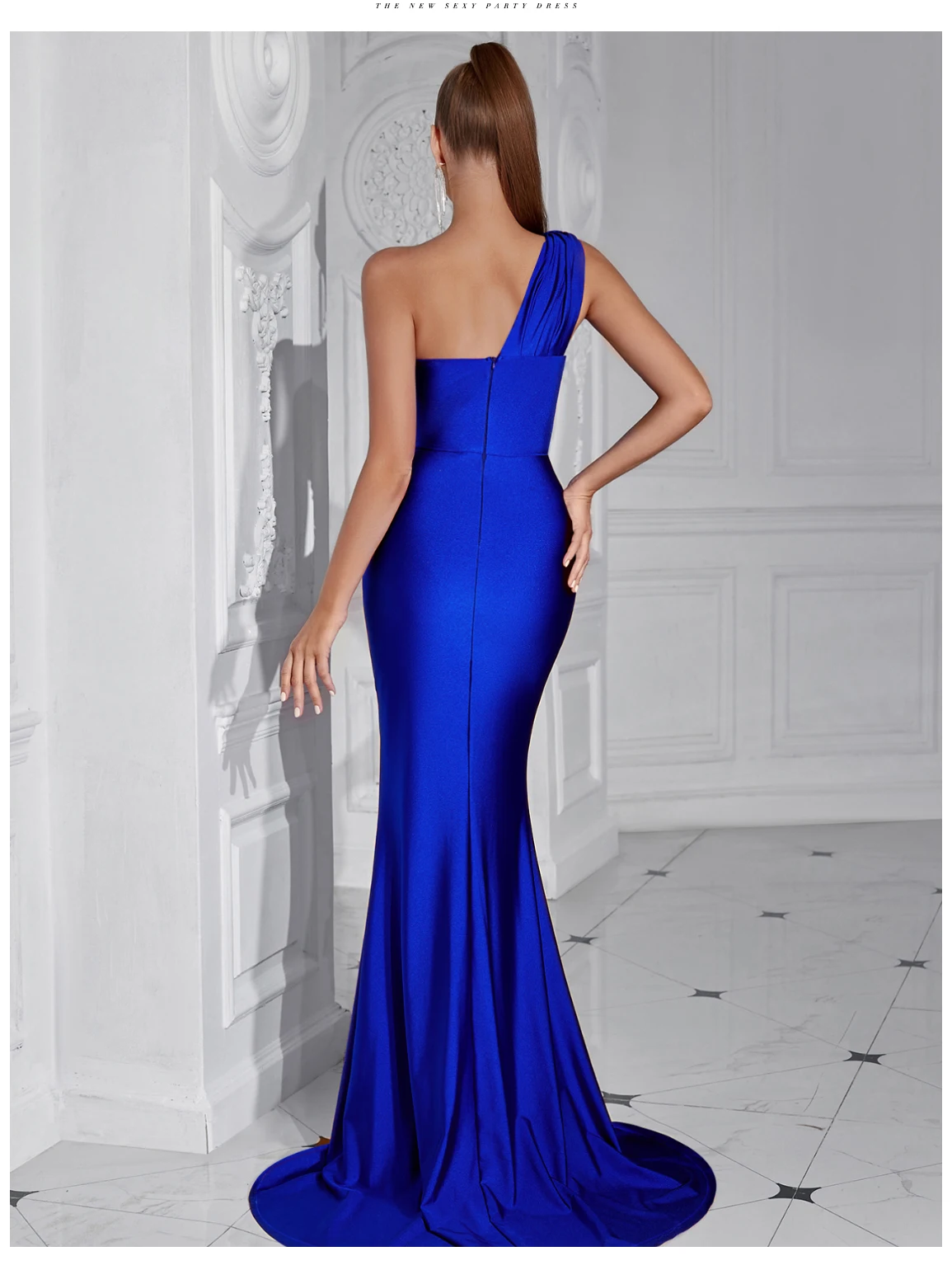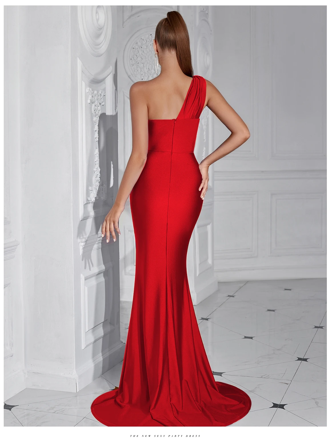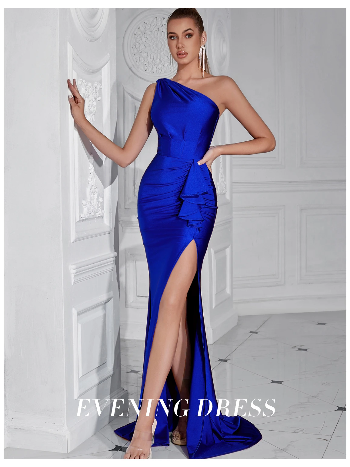Olivia Summer Sleeveless Draped Fashion Celebrity Ruffle Outfits Sexy Dresses One Shoulder Elegant Women's High Slit Dress